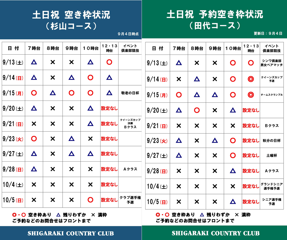 9月4日時点の土日祝日の空き状況です。